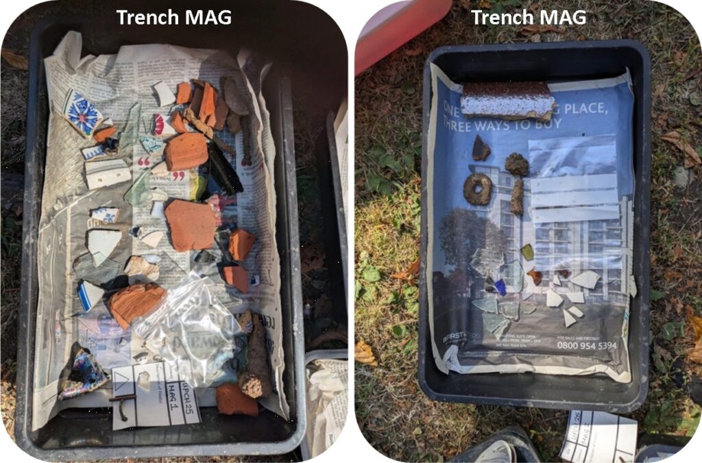 The last of our 2025 Archaeology Experience Weekends has taken place. Work continued in all of the Y-trenches as well as the new trench, designated MAG which was de-turfed the previous weekend by the magnetometry team. After only going down couple of inches in this trench was full of an array of finds including pottery, ceramic, porcelain, metal, brick and tiles.