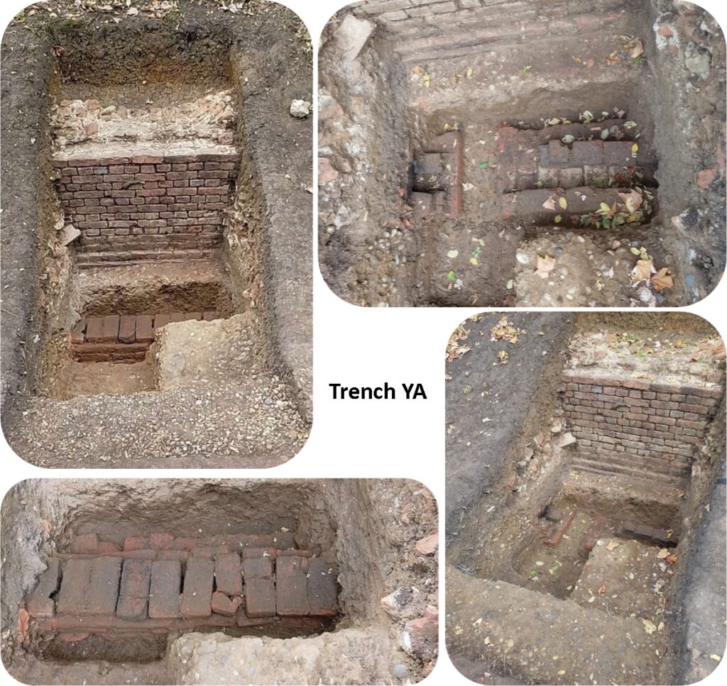 Trench YA: The sequence of bricks forming the top of the French drain have now been removed. The drain is intact and in good condition, though it appears the inside of the drain has been stained white. Is this an early form or waterproofing or has some form of liquid entered the drain and stained it? Further excavation of the area beneath the drain continues.