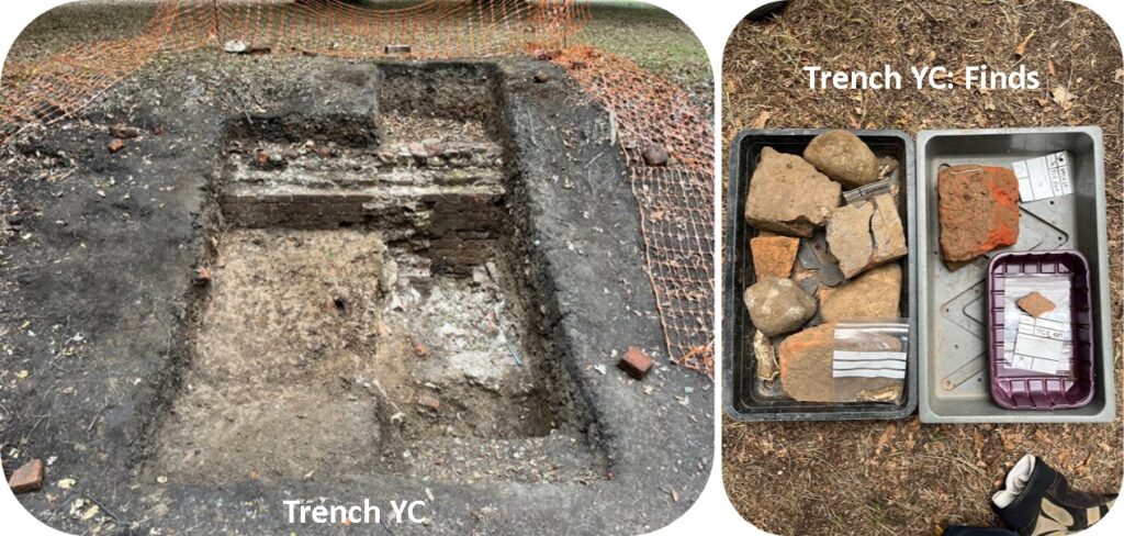Trench YC: Excavation of Trench YC is continuing at pace. Currently we are at contexts YC2 (middle left) & YC3 (bottom left). The extent of the Tudor wall & buttress is now much easier to see. Finds include large cobbles, a brick fragment stamped with either the letter A or V, a worked brick with a rounded edge (right hand tray), glass, animal bone, clay pipe stem, window glass, bottle glass & pottery.